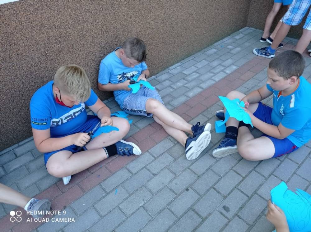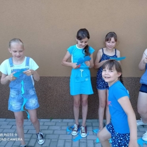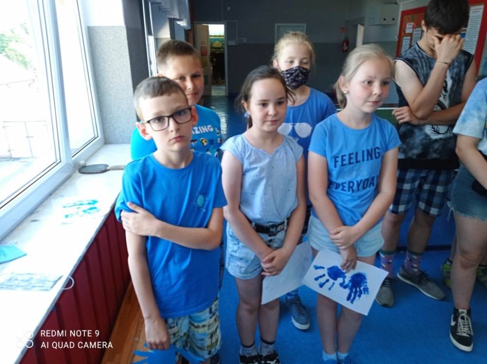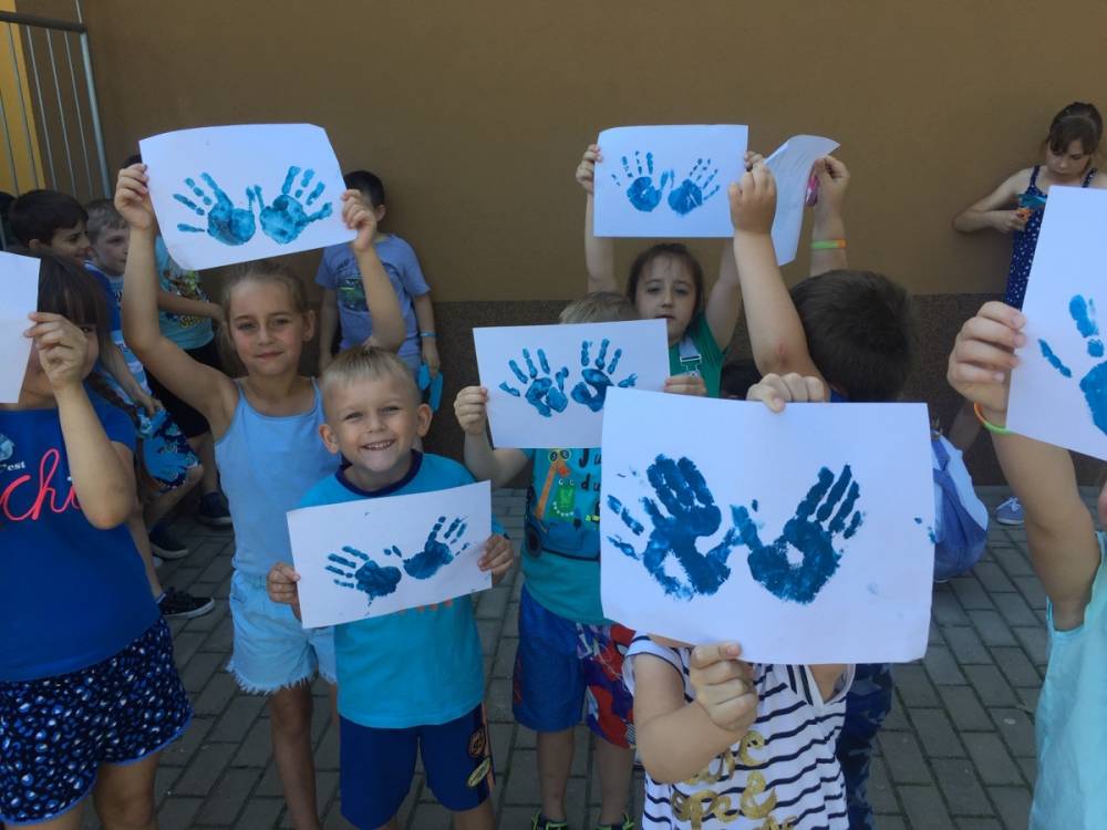 My dzisiaj wszyscy ubraliśmy się na niebiesko. Jedną lekcję poświęciliśmy na wykonanie zadania. Wszyscy uczniowie wykonali swoje niebieskie motyle oraz napis z pozdrowieniami. Po wykonaniu zadania młodsi uczniowie mogli się pobawić niebieskimi balonami.