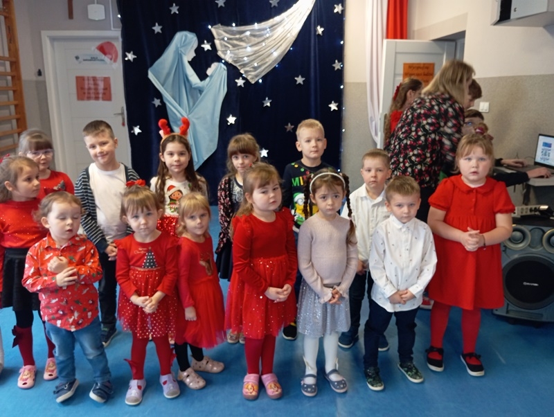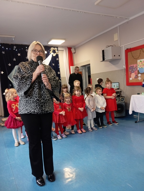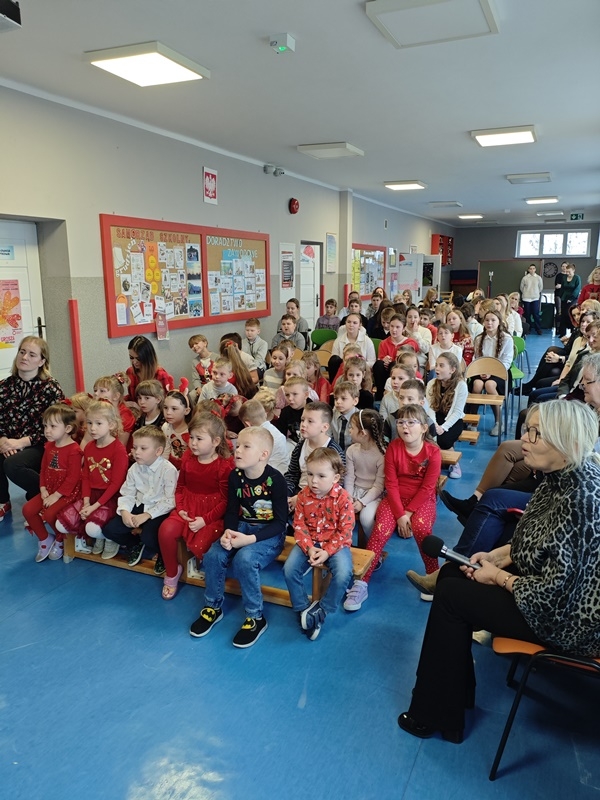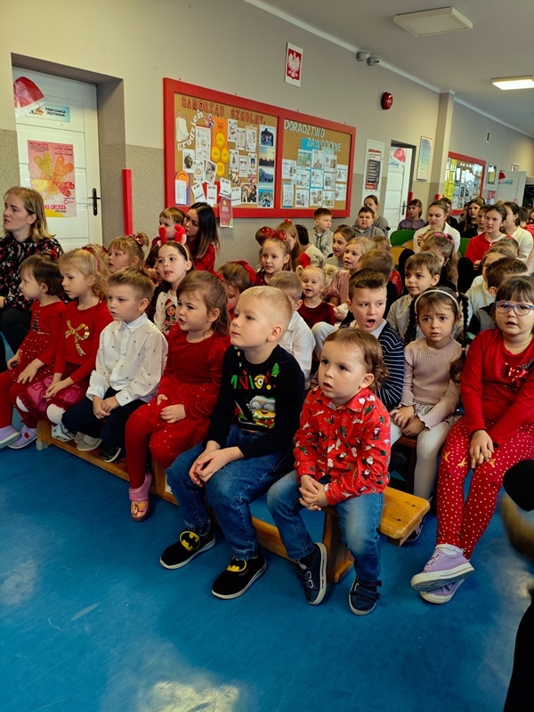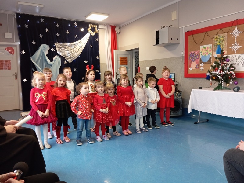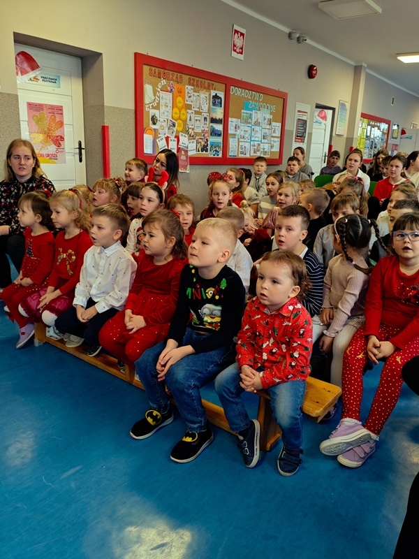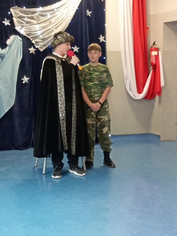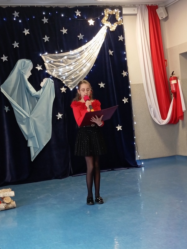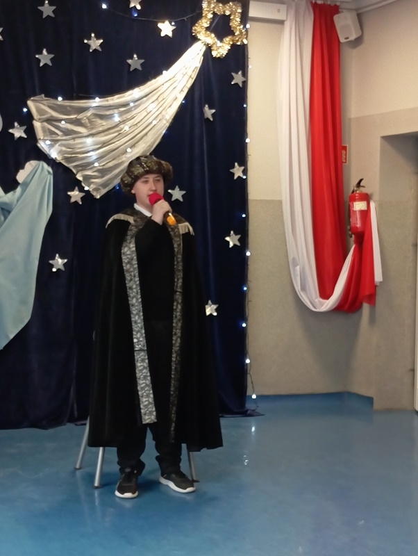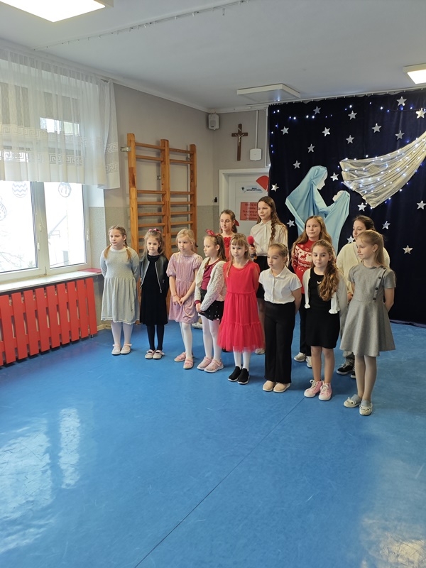 Po części teatralnej uczniowie wraz z rodzicami i cała wspólnotą szkolną wspólnie zaśpiewali kolędy, które wypełniły salę ciepłem i radością. Na zakończenie uroczystości nastąpiło dzielenie się opłatkiem oraz składanie świątecznych życzeń, co było pięknym symbolem jedności i wzajemnej życzliwości.