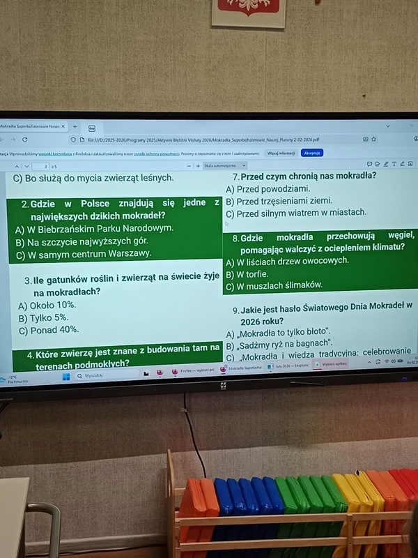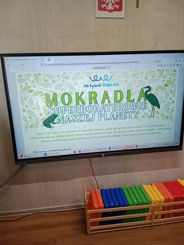 Podczas zajęć z klasą V w ramach programu #AktywniBłękitni został zrealizowany scenariusz poświęcony Światowemu Dniowi Mokradeł. Dzieci razem z nauczycielem omówiły prezentację przygotowaną na obchody święta w 2026 roku. Następnie, wykorzystując zdobytą wiedzę, wykonały plakat w formie rysunku, a na zakończenie rozwiązały test sprawdzający wiadomości o mokradłach.
